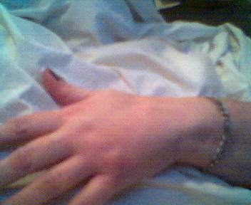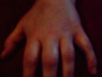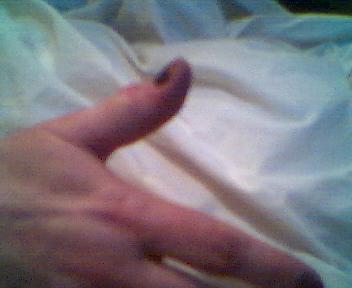 Peggy's PR Story Hi, I'm Peggy. I am 44 years old and live in southern Iowa. I have be dealing with PR for over three years and diagnosed for just over a year. I am married to a wonderful guy for 25 years and have three kids. My adventure started with a diagnosis of upper GI problems, then pneumonia, then lupus before finally finding a rheumy who knew about PR. I am very excited about this new site and sharing information with everyone! I have a couple pictures to share with you all. Keep in mind that I am not real good at pics even when my hands are cooperating! The one is of my right thumb. It became so swollen that I couldn't even bend it. Terribly painful and eventually turned a bit black and blue from lack of sufficient blood flow. The other picture is of my left hand. It swelled like a balloon at the same time as my thumb. Oddly when the back of my hand swells like this, there is no pain and it doesn't really bother me much. Just makes me look like the Pillsbury Dough Boy. If I should get some better pics later I will send them on. Pic 1. Right Thumb